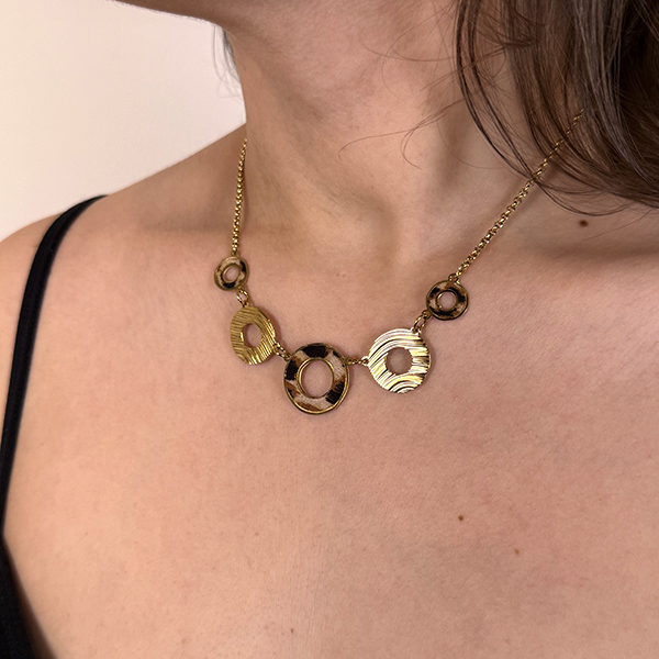 Το προϊόν διαθέτει λεπτή αλυσίδα που αγκαλιάζει αρμονικά το λαιμό. Στο κέντρο του κρέμεται ένα κομψό μοτίφ, το οποίο μπορεί να είναι απόλυτα μοντέρνο ή κλασικό, ανάλογα με το προσωπικό σας στιλ. Η λαμπερή επιφάνεια του ανοξείδωτου ατσαλιού προσθέτει λάμψη και φωτεινότητα, καθιστώντας το κολιέ εντυπωσιακό και παράλληλα καθημερινό.