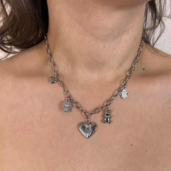 Το προϊόν διαθέτει λεπτή αλυσίδα που αγκαλιάζει αρμονικά το λαιμό. Στο κέντρο του κρέμεται ένα κομψό μοτίφ, το οποίο μπορεί να είναι απόλυτα μοντέρνο ή κλασικό, ανάλογα με το προσωπικό σας στιλ. Η λαμπερή επιφάνεια του ανοξείδωτου ατσαλιού προσθέτει λάμψη και φωτεινότητα, καθιστώντας το κολιέ εντυπωσιακό και παράλληλα καθημερινό.